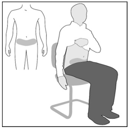 2. Сядьте или лягте в удобной позе. Возьмите кожную складку в нижней части живота, но не менее 5 см от пупка (рис. 1). Поочередно вводить в левую и правую части брюшной полости. Если инъекция в брюшную область невозможна, обратитесь к медсестре или к врачу за дальнейшими инструкциями. |